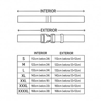 Las siguientes tallas corresponden a las medidas del cinturón tomadas de punta a punta, pero sin incluir las hebillas (medida de la hebilla exterior: 5cm). Se detallan las medidas de los velcros interiores en cada caso.